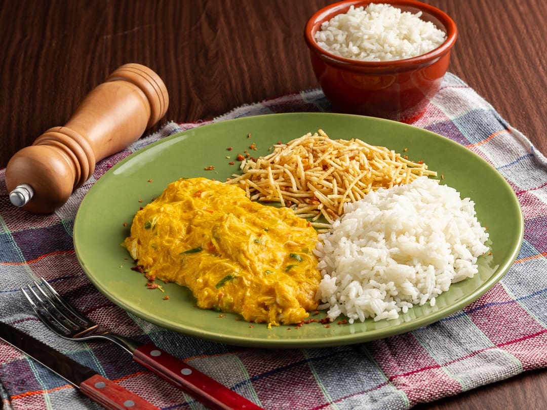 Vatapá de frango acompanhado de arroz branco e batata palha.