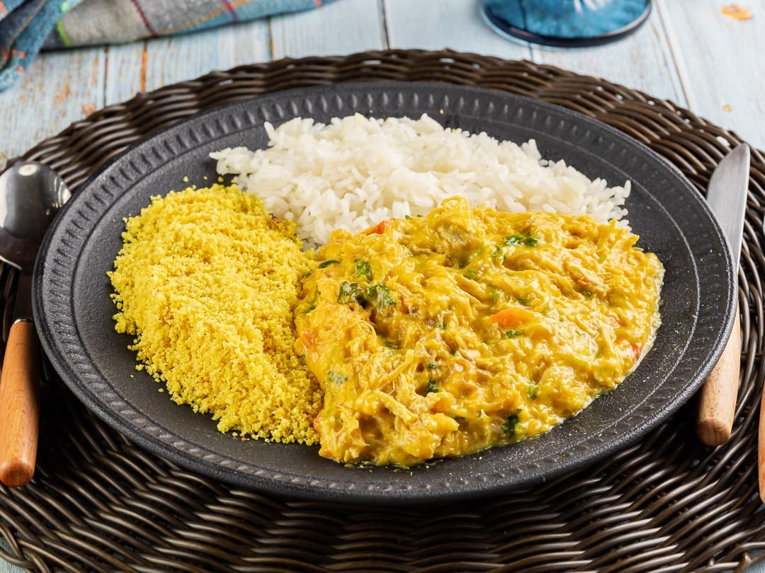 Filé de arraia desfiada, salteada com cebola, pimentão, tomate, alho e pimenta de cheiro, finalizada com molho cremoso de leite de coco e dendê (Acompanha arroz branco e farofa)