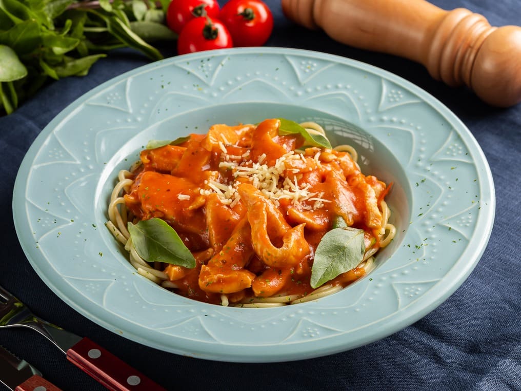 Fettucine com filé de peito frango em cubos, finalizado com molho de tomates caseiro e manjericão.