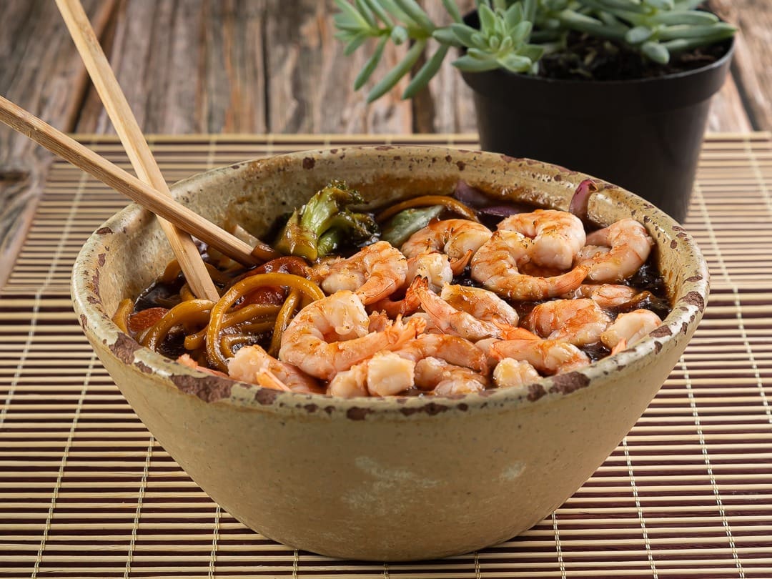 Camarões flambados com legumes (repolho, cebola, cenoura, e brócolis) finalizado com molho especial da casa.