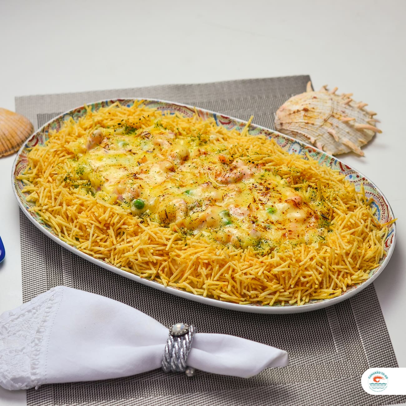 Apresentamos nosso 'Camarão à Grega', uma opção sofisticada e deliciosa do nosso 'Top 5 mais bem avaliados!'. Esta iguaria é cuidadosamente preparada com camarões frescos, empanados na crocante farinha panko, generosamente cobertos com o derretido e suculento queijo muçarela. É finalizado com nosso autêntico molho de tomate caseiro, que adiciona o toque final de sabor e frescor. O prato é perfeitamente acompanhado por um arroz à grega e batata palha crocante para uma experiência culinária completa.
