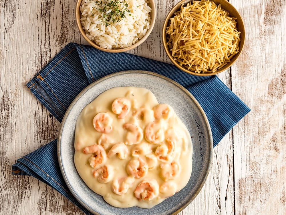 Camarões temperados com tempero especial da casa, flambados no conhaque e manteiga do sertão, finalizado com molho cremoso aos quatro queijos (Acompanha até 2 guarnições)
