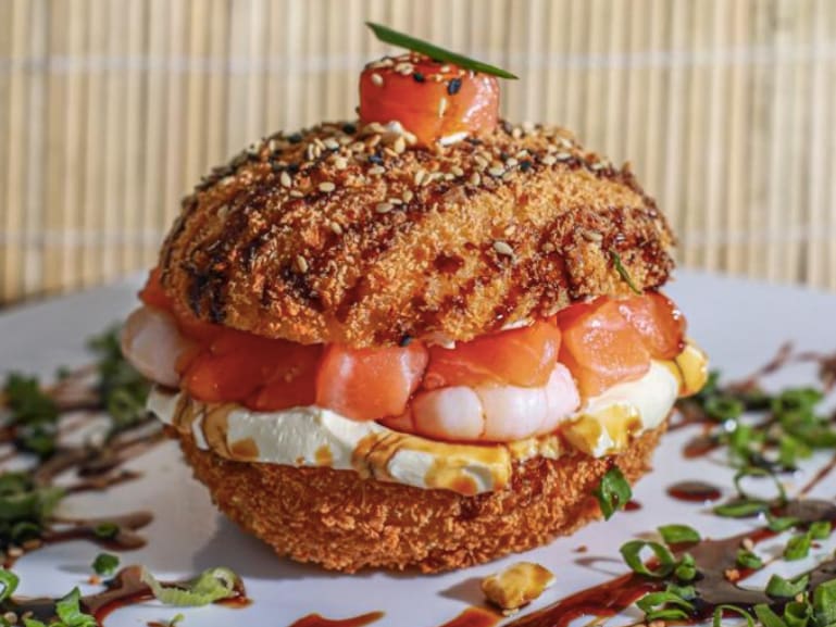 Arroz de sushi empanado em formato de pão, recheado com cream cheese, camarão e salmão, finalizado com tarê, cebolinha e gergelim moído.