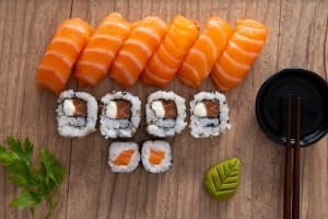 Arroz japonês, salmão maçaricado, cream cheese e finalizado com couve crispy.