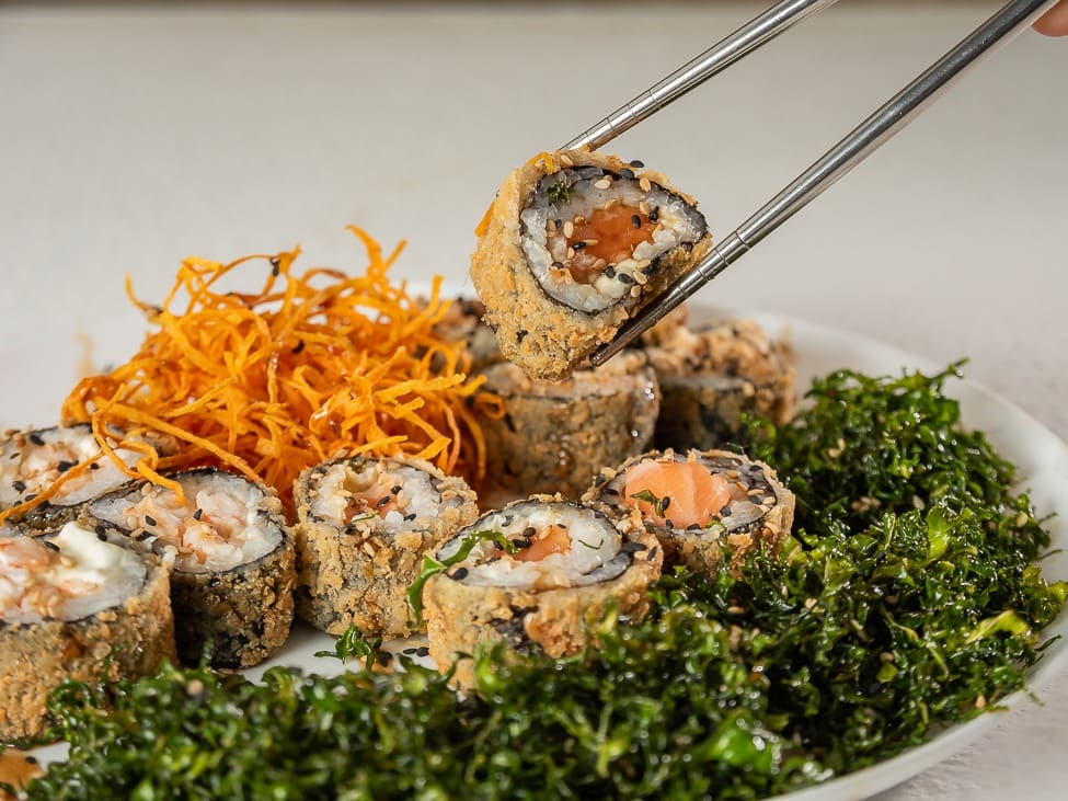 Hot roll crocante de camarão, salmão, arroz japonês e cream cheese, finalizado com gergelim, cebolinha e molho teriyaki.
