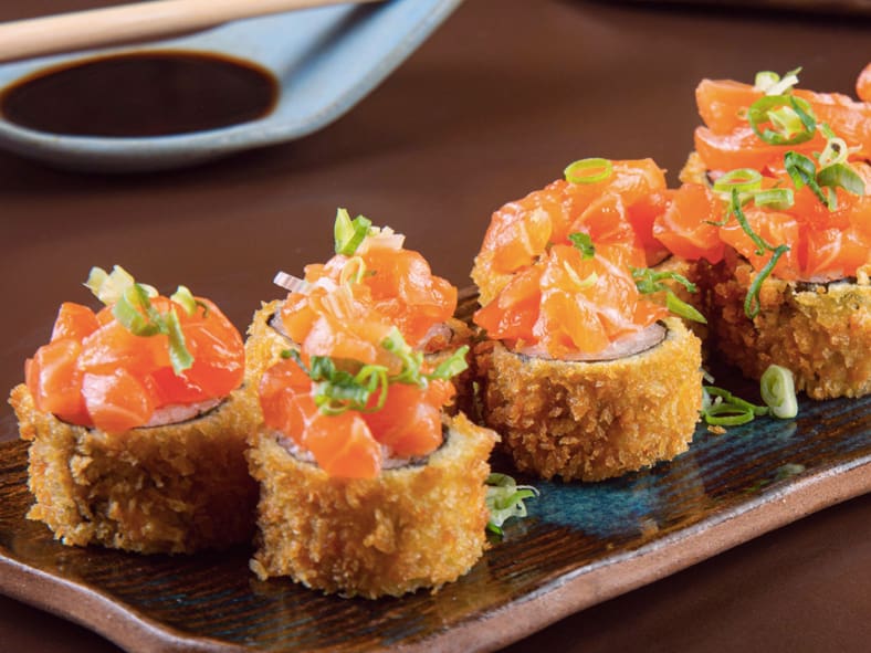 Hot roll de alga com arroz japonês, salmão, cream cheese e cebolinha, ganham um delicioso acréscimo de tartar de salmão por cima.