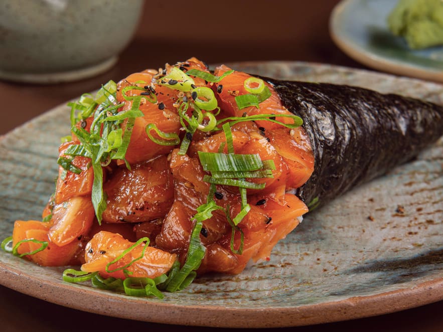 Hot roll de alga com arroz japonês, salmão, cream cheese e cebolinha, ganham um delicioso acréscimo de tartar de salmão por cima.
