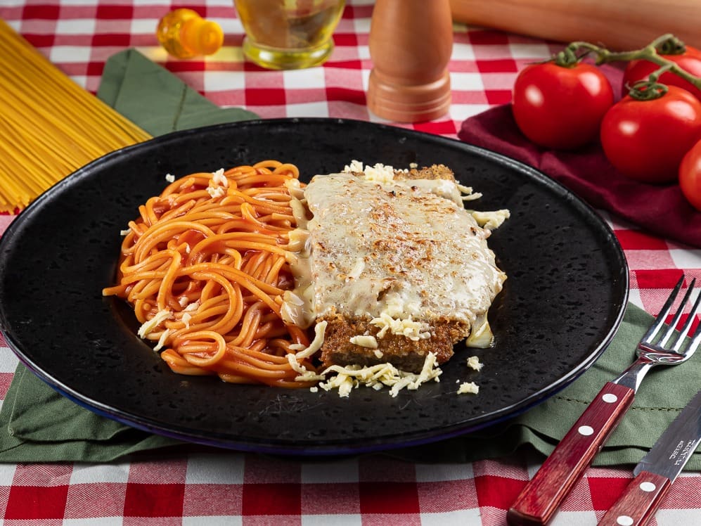 Escalope de carne à milanesa, servidos sobre massa a sua escolha ao molho de tomates frescos e gratinados com queijos mussarela.